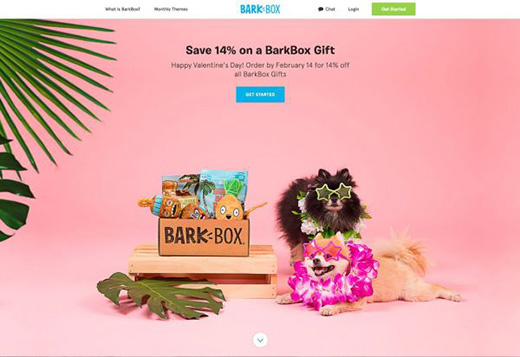 你在著落頁上所放置的內(nèi)容,都應(yīng)該盡量讓用戶盡可能接近實際的目標(biāo)。BarkBox 的著陸頁上,設(shè)計師的目標(biāo)是讓用戶購買狗玩具,或者提交郵箱訂閱信息。上面是他們的情人節(jié)促銷頁面,主題貼切,目標(biāo)明確。(注意頁面的核心是CTA按鈕“Get Start”)