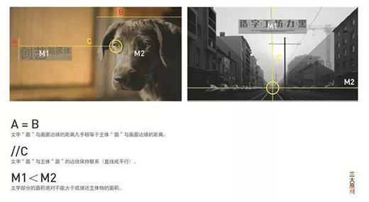 文字部分與主體物之間的位置大小關(guān)系有三大原則: