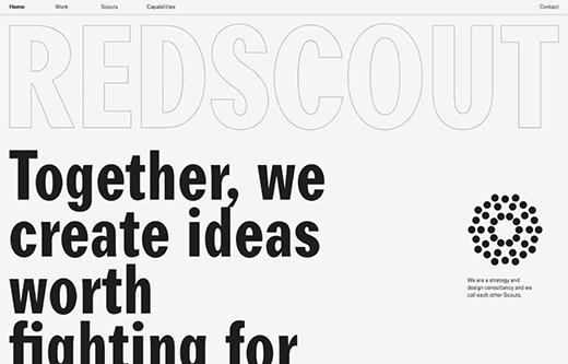 本文開頭提到的網(wǎng)站Phase 3其實(shí)就具有這樣概述版式的設(shè)計(jì)。Redscout還使用大輪廓字體作為其網(wǎng)頁設(shè)計(jì)美學(xué)的一部分,結(jié)合動(dòng)畫將字母的“填充”體現(xiàn)出來,當(dāng)你向下滾動(dòng)頁面時(shí),只留下輪廓。