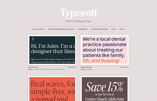 作為備受歡迎的排版趨勢(shì)網(wǎng)站,Typewolf仍舊使用復(fù)古的排版和顏色來設(shè)計(jì)其網(wǎng)站頁面,同時(shí)仍保持美學(xué)的現(xiàn)代性。他們的字體與背景顏色搭配,視覺上很復(fù)古,但卻絲毫不讓人覺得過時(shí)。