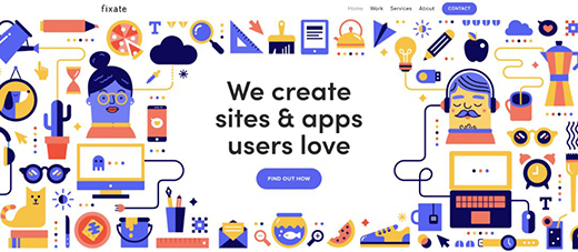 像DottedSign(上圖)和Fixate(下圖)這樣的網(wǎng)站就很好的詮釋了這種增長趨勢(shì)。這兩個(gè)網(wǎng)站都使用了非常合適的和細(xì)節(jié)化的插圖,從而把整個(gè)網(wǎng)站緊密的連接在一起。