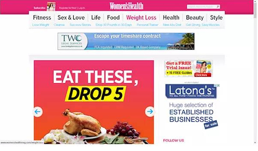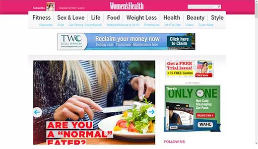 在下圖中,在婦女健康雜志網(wǎng)站上面的橫幅是粉紅色的,但其他地方避免使用顏色,反而是用圖像和粗的導(dǎo)航。這個有趣的設(shè)計選擇對網(wǎng)站起到了反作用。