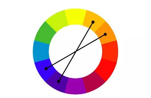 第二種方法有一點難并且你可能為了證明它是恰當(dāng)合適的顏色不得不去做些實驗,如果實驗做得好,它會是非常有效的。這個概念用了四種顏色,即兩組對比色(色環(huán)上相鄰兩個顏色的180度補色)