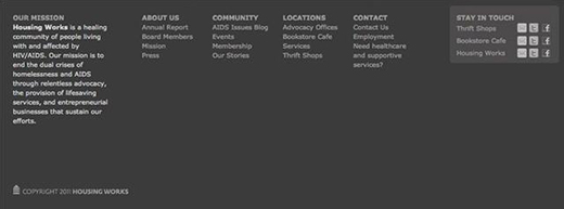 頁(yè)腳是您如何在不妨礙設(shè)計(jì)的情況下通過(guò)大量信息與觀眾聯(lián)系的方式。由于頁(yè)腳位于頁(yè)面底部,因此它是放置小型站點(diǎn)地圖、公司或聯(lián)系信息、鏈接和站點(diǎn)上下文的合理位置。
