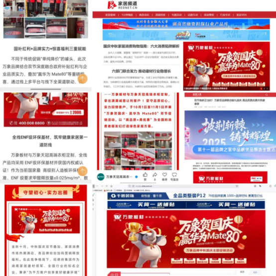 萬象品牌中秋國慶主題促銷活動實(shí)現(xiàn)全域覆蓋式傳播。通過整合多元網(wǎng)絡(luò)渠道,聯(lián)動紅網(wǎng)、新浪家居、行業(yè)權(quán)威媒體及公眾號等平臺,精準(zhǔn)觸達(dá)高價值客群,真正達(dá)成“傳播無死角,觸達(dá)有精度”的目標(biāo)。