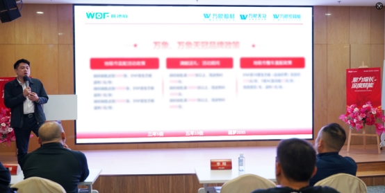 省內(nèi)品牌加盟中心副總經(jīng)理湯科先生登臺,開展產(chǎn)品推薦與政策宣講。他重點(diǎn)聚焦萬象、萬象天冠兩大品牌,既詳細(xì)解讀品牌專屬活動的政策細(xì)節(jié),明確合作權(quán)益與支持力度,又深入拆解針對加盟商的定制化專屬政策,為伙伴精準(zhǔn)匹配合作方案,助力高效對接業(yè)務(wù)。