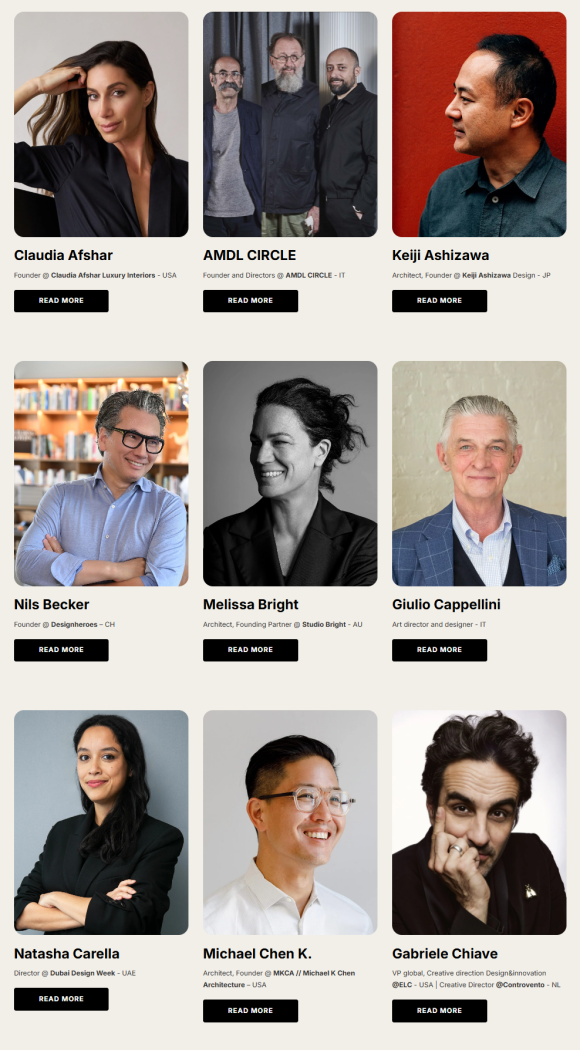 本屆賽事評審團(tuán)堪稱"設(shè)計(jì)界的全明星陣容",匯聚43位全球創(chuàng)意領(lǐng)袖。涵蓋建筑、室內(nèi)、藝術(shù)與可持續(xù)發(fā)展領(lǐng)域。國際評委包括(列舉部分):